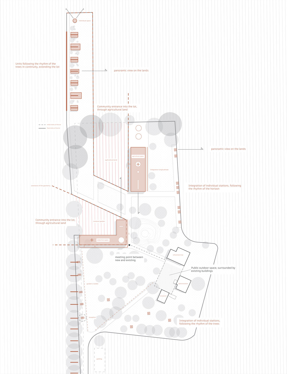Dans le cadre du concours La Madreselva, le projet développé s’inscrit sur le site en suivant les différents rythmes de la campagne argentine. En effet, les nouveaux volumes s’intègrent à la parcelle selon la rythmique offerte par le paysage : la longévité des espaces collectifs rappelle les terres agricoles et les unités d’habitation prolongent la régularité des arbres longeant le lot. Les limites de la parcelle ont été dépassées afin d’offrir une intimité aux habitations et de faire entrer les terres agricoles dans l’implantation, créant une connexion directe avec l’environnement.