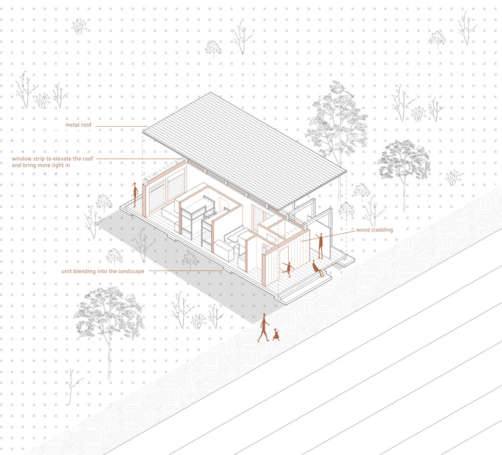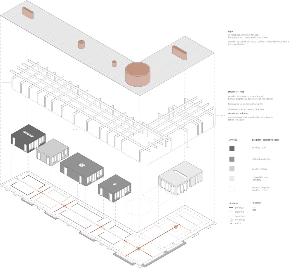 Les bâtiments existants offrent des espaces dédiés à la gastronomie et à la festivité, reliés ensemble par un espace extérieur. L’organisation spatiale des nouveaux espaces collectifs incite à la rencontre, permettant de mettre en relation les différents occupants sur le site, où culture et apprentissages sont partagés. Pour leur part, les unités d’habitation sont dédiées au repos, au retrait et à répondre aux besoins immédiats des résidents.
