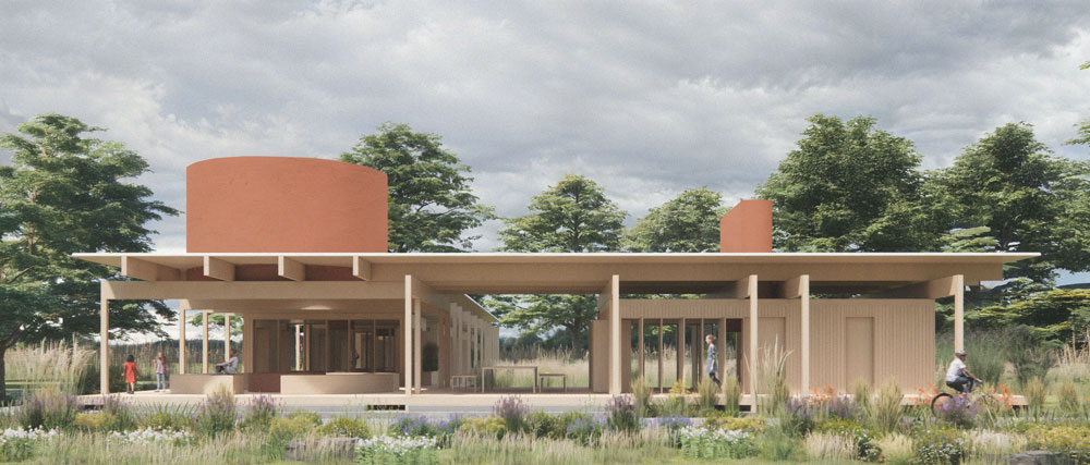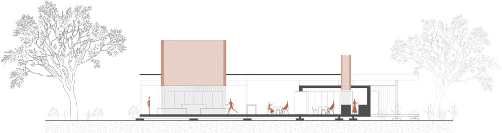 Le langage architectural s’inscrit en harmonie avec le paysage : la toiture de tôle métallique fine, surélevée par une structure de bois, rappelle l’horizon de la campagne. Les puits de lumière, repères dans l’espace par leur couleur terracotta, reprennent l’allure des arbres ponctuels longeant l’horizon. Ils permettent une entrée de lumière et sont disposés selon les différents usages. Finalement, les volumes se déposent sur la parcelle en étant surélevés sur un socle, rappelant la même légèreté que la toiture.